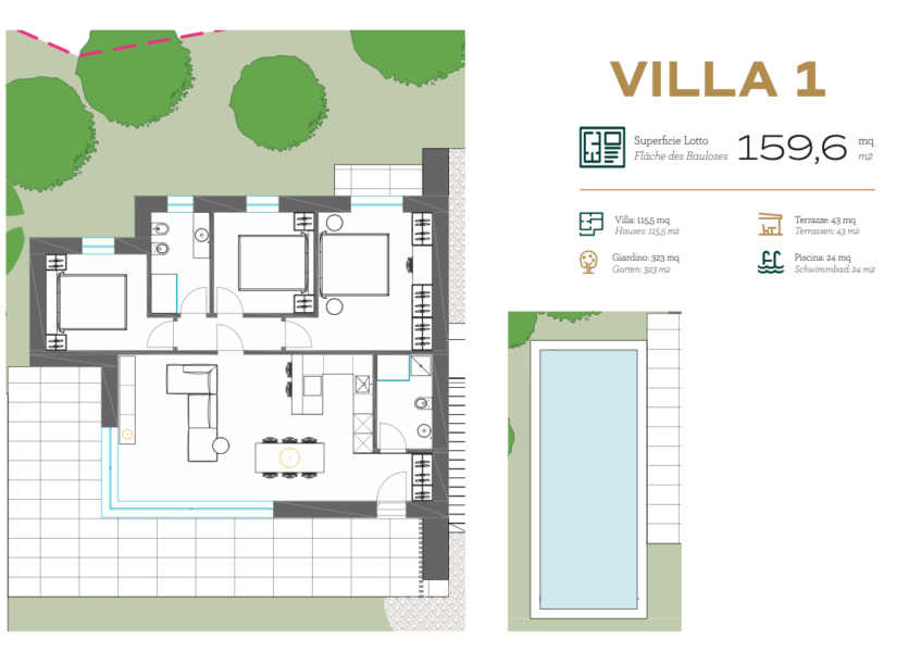 L’insediamento, completamente immerso in un’oasi verde, è composto da 4 porzioni di villa di pregio, di ampia metratura, tutte dotate di piscina e giardino privato!