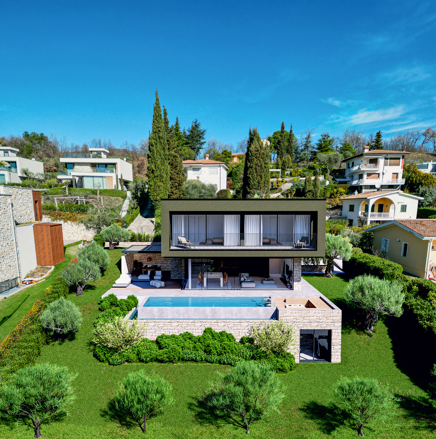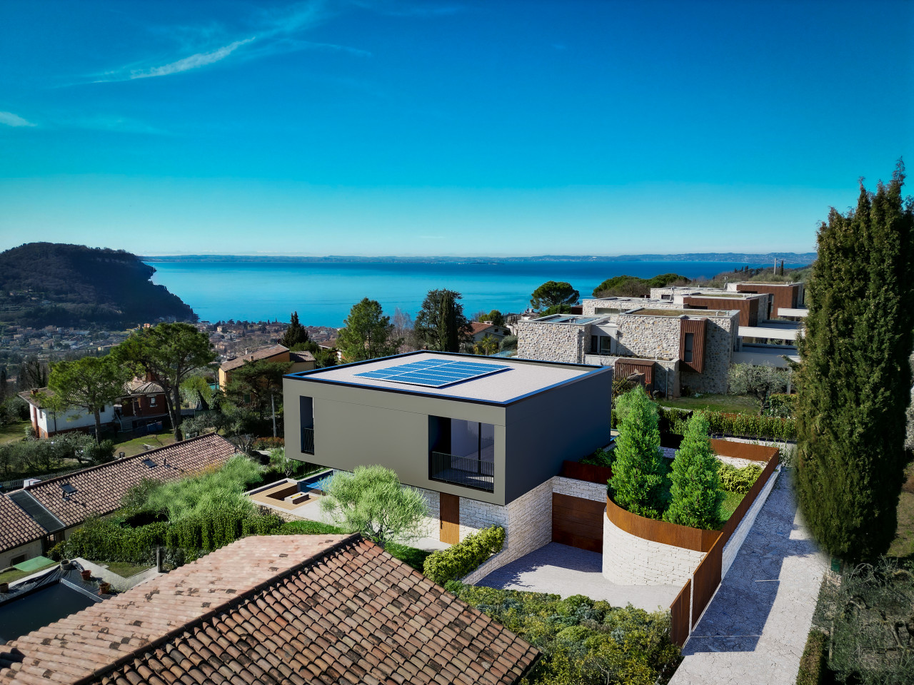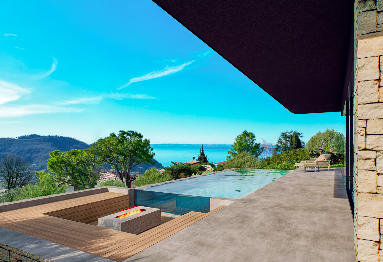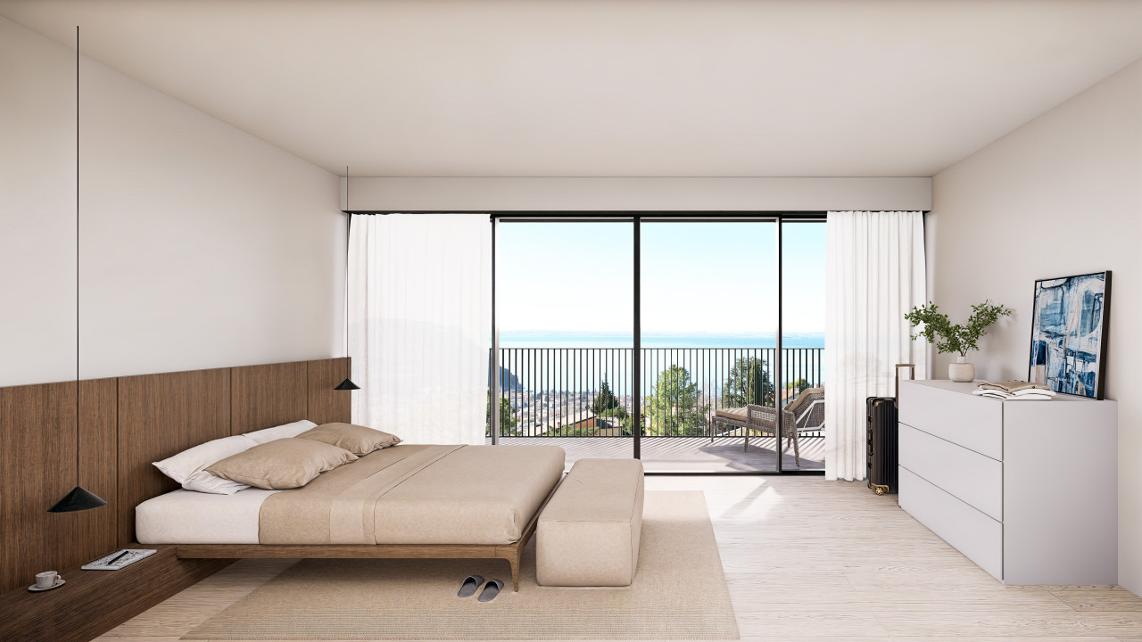 ampia zona giorno living di 60 mq con vetrata vista lago, bagno e accesso alla spaziosa area esterna con piscina infinity a sfioro. Al piano superiore, 3 ampie camere matrimoniali tutte con bagno en suite e la terrazza panoramica vista lago di 21 mq.